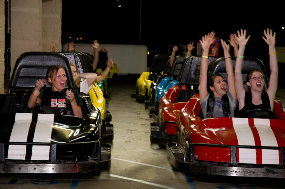 Must be 58″ or taller to drive go karts. Go Kart passengers must be at least 3 years old, under 58″ and ride with an adult driver.